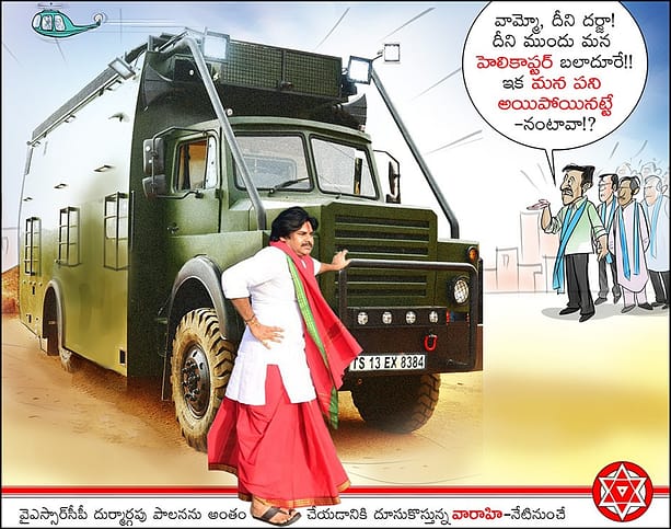 ఇదిలా ఉంచితే వారాహి యాత్రపై  జ‌న‌సేన రూపొందించిన కార్టూన్  సోష‌ల్ మీడియాలో హాల్ చ‌ల్ చేస్తోంది. వైఎస్సార్‌సీపీ దుర్మార్గ‌పు పాల‌న‌ను అంతం చేయ‌డానికి దూసుకొస్తున్న వారాహి  క్యాప్ష‌న్ తో రూపొందించిన పోస్ట‌ర్ పై జ‌న‌సైనికులతో పాటు ప్ర‌తిపక్ష టీడీపీ నేత‌లు కామెంట్ల‌తో రెచ్చిపోతున్నారు. రాక్షస పాల‌న అంతం చేయ‌డానికి వ‌స్తున్న జ‌న‌సైనికుడి ప్ర‌చార ర‌థం వారాహి చూస్తుంటే వైసీపీ నేత‌ల‌కు గుండెల్లో ద‌డ పుడుతుందని ఎద్దేవ చేస్తూ కామెంట్లు జోడిస్తున్నారు.