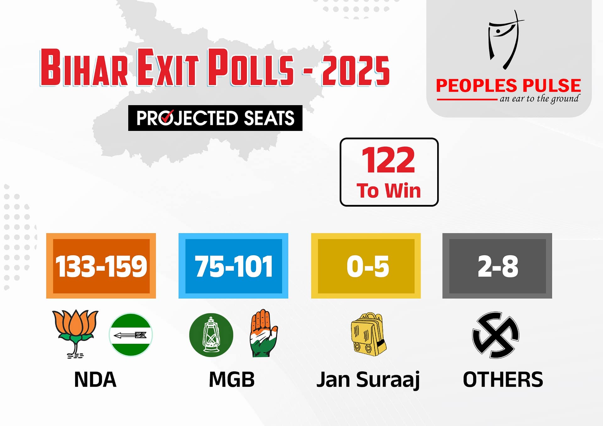 బీహార్ 2025 అసెంబ్లీ ఎన్నికల్లో బీజేపీ, జేడీయూ(యూ) నేతృత్వంలోని ఎన్డీఏ కాంగ్రెస్, ఆర్జేడీ నేతృత్వంలోని మహాఘట్ బంధన్ పై భారీ ఆధిక్యంతో అధికారం చేపడుతుందని పీపుల్స్ పల్స్ ఎగ్జిట్ పోల్ సర్వేలో వెల్లడైంది. ఎన్డీయే దాదాపు 8.3 శాతం ఓట్ల ఆధిక్యంతో మహాఘట్ బంధన్ కూటమి మీద పైచేయి సాధిస్తోంది. ఎన్డీయేకి 46.2 శాతం ఓట్లు, మహాఘట్ బంధన్ కు 37.9 శాతం, కొత్తగా స్థాపించిన జన్ సురాజ్ పార్టీకి 9.7 శాతం, ఇతరులకు 6.2 శాతం ఓట్లు వచ్చే అవకాశాలున్నాయి. ఈ సర్వే ఫలితాల్లో మూడు శాతం ‘ప్లస్ ఆర్ మైనస్’ ఉండే అవకాశాలున్నాయి. 243 స్థానాలు ఉన్న బీహార్ లో అధికారం చేపట్టడానికి కావాల్సిన మ్యాజిక్ ఫిగర్ 122 కాగా, ఎన్డీయేకు 133-159 స్థానాలు వచ్చే అవకాశాలుండగా, మహాఘట్ బంధన్ 75-101 స్థానాలకు పరిమితమయ్యే అవకాశాలున్నాయి. ఇతరులకు 2  – 8 స్థానాలు,  జన్ సురాజ్ పార్టీకి 0-5  స్థానాలు వచ్చే అవకాశాలున్నాయి.