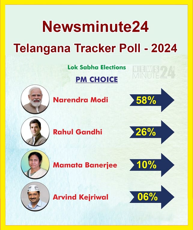 Newsminute24 వెబ్ సైట్ సర్వే లో ప్రధానిగా ఎవరికి మద్దతిస్తారు అన్న ప్రశ్నకు ప్రజలు మోదీకి పట్టం కట్టారు. అన్ని వర్గాల ప్రజలు మోదీ పనితీరు పట్ల సానుకూలంగా ఉన్నట్లు ట్రాకర్ పోల్ సర్వేలో తేలింది. ప్రధానిగా 58 శాతం ఓట్లతో మోదీ మొదటి స్థానంలో నిలవగా..26 శాతం ఓట్లతో రాహుల్ గాంధీ రెండో స్థానంలో నిలిచినట్లు సర్వే లో వెల్లడైంది. బెంగాల్ సీఎం మమతా బెనర్జీ 10 శాతం ఓట్లతో మూడో స్థానంలో.. 6 శాతం ఓట్లతో ఢిల్లీ సిఎం క్రేజీవాల్ నాలుగో స్థానంలో నిలిచినట్లు newsminute24 ట్రాకర్ పోల్ సర్వే రిపోర్ట్ చెబుతోంది.