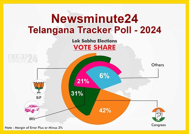 ఇక సీట్ల పరంగా చూస్కుంటే.. బీజేపీ 8 నుంచి 12 స్థానాలు గెలుచుకునే అవకాశం ఉన్నట్లు newsminute24 సర్వే వెల్లడించింది. కాంగ్రెస్ పార్టీ 4 నుంచి 5 స్థానాలు .. బీఆర్ఎస్, ఎంఐఏం ఒక్కో స్థానాలు గెలుచుకునే అవకాశం ఉన్నట్లు సర్వేలో తేలింది. ఓట్ల శాతం పరంగా.. బీజేపీకి 42 % ఓట్లు. కాంగ్రెస్ పార్టీకి 31% ఓట్లు.. బిఆర్ఎస్ పార్టీకి 21% ఓట్లు వచ్చే అవకాశం ఉన్నట్లు newsminute24 సర్వే వెల్లడించింది.