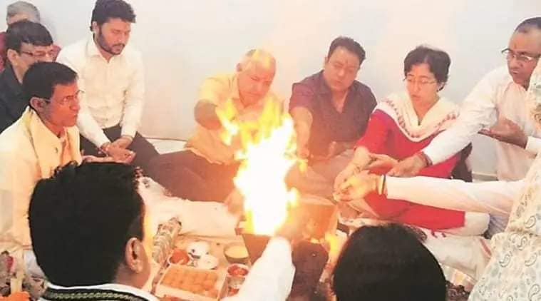 ( ఫోటో 1. తల్లిదండ్రులలో ఆతిశీ, ఫోటో 2. 2019 పార్లమెంటు ఎన్నికల సమయంలో తాను పోటీచేసిన ఈస్ట్ డిల్లీ నియోజకవర్గ ‘ఆప్’ ఎన్నికల ఆఫీస్ లో చేస్తున్న హోమంలో పాల్గొన్న ఆతిశీ)