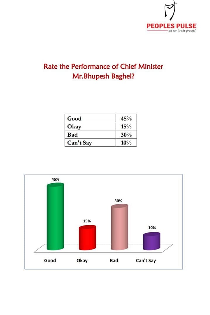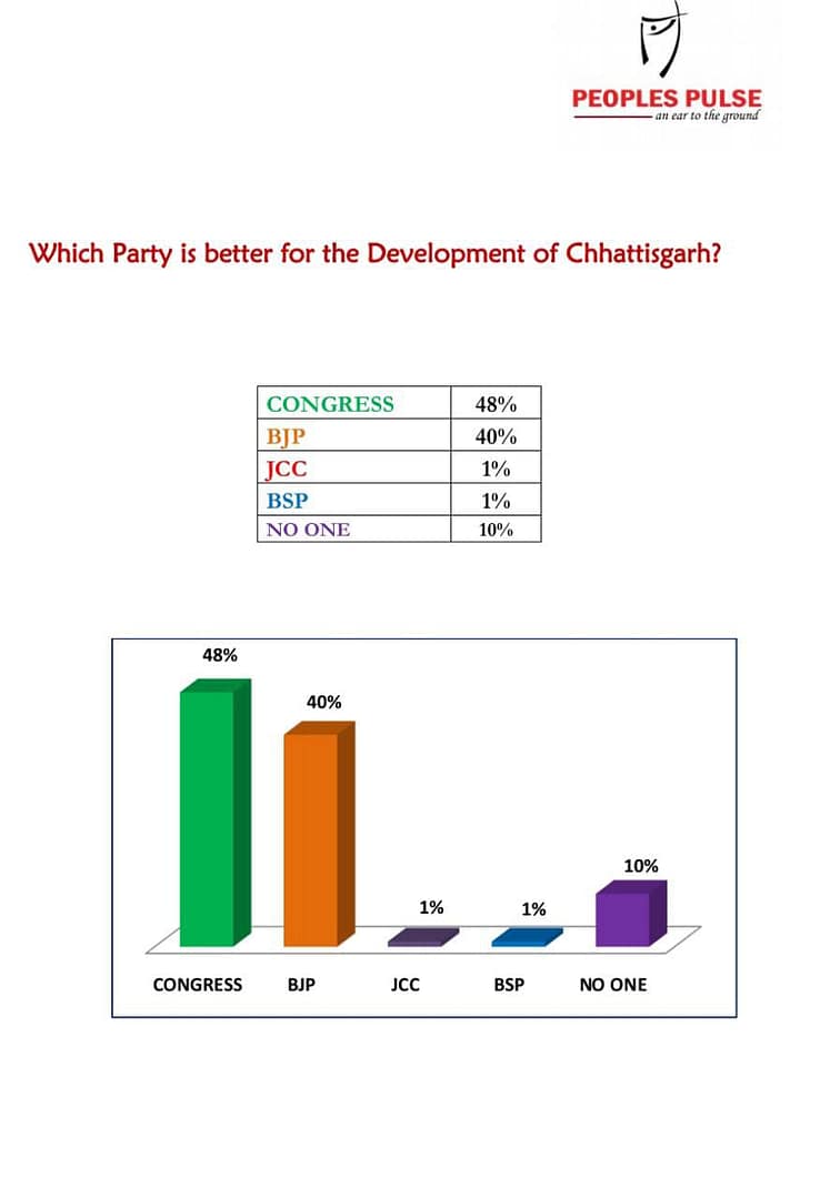 ఛత్తీస్‌గఢ్‌ అభివృద్ధికి ఏ పార్టీ కృషి చేస్తుందని ఓటర్లను పీపుల్స్‌ పల్స్‌ అడగగా కాంగ్రెస్‌ అని 48%, బీజేపీ అని 40%, జేసీసీ అని ఒక శాతం, బీఎస్పీ అని ఒక శాతం, ఎవరూ కారని 10% మంది అభిప్రాయపడ్డారు. కాంగ్రెస్‌కు మరోసారి అవకాశమిస్తారా అని సర్వేలో ఓటర్లను అడగగా అవకాశం ఇస్తామని 47%, ఇవ్వమని 40%, ఏమీ చెప్పలేమని 13% మంది తెలిపారు. బీజేపీకి మూడు మార్లు అవకాశమిచ్చినట్టే కాంగ్రెస్‌కు కూడా మరోసారి అవకాశమిద్దామనే అభిప్రాయాన్ని ఓటర్లు వెల్లడిరచారు. ముఖ్యమంత్రి పనితీరు ఎలా ఉందని ఓటర్లను ప్రశ్నించగా బాగుందని 45%, పర్వాలేదని 15%, బాగోలేదని 30%, ఏమీ చెప్పలేమని 10% మంది అభిప్రాయపడ్డారు. గత నాలుగున్నర సంవత్సరాలుగా రాష్ట్రంలో కాంగ్రెస్‌ ప్రభుత్వ పనితీరుపై ఓటర్లను సర్వేలో ప్రశ్నించగా 20% సంతృప్తిగా ఉన్నట్టు, 31% పాక్షింగా సంతృప్తిగా ఉన్నట్టు, 17% అసంతృప్తిగా ఉన్నట్టు, 21% పాక్షికంగా అసంతృప్తిగా ఉన్నట్టు, ఏమీ చెప్పలేమని 11% మంది అభిప్రాయపడ్డారు.