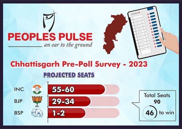 ఛత్తీస్గఢ్లో పీపుల్స్ పల్స్ సంస్థ నిర్వహించిన ప్రీ`పోల్ సర్వేలో కాంగ్రెస్ 55`60, బీజేపీ 28`34, బీఎస్పీ, ఇండిపెండెంట్లు రెండు స్థానాలు గెలిచే అవకాశాలున్నాయని తేలింది. 90 అసెంబ్లీ స్థానాలున్న రాష్ట్రంలో మ్యాజిక్ ఫిగర్ 46. రాబోయే ఎన్నికల్లో ప్రధాన పోటీ కాంగ్రెస్, బీజేపీ మధ్య ఉన్నా కాంగ్రెస్ సొంతంగా మెజార్టీ సాధించే అవకాశాలు పుష్కలంగా ఉన్నాయి.