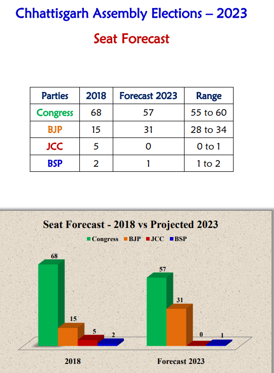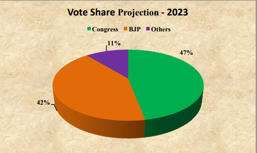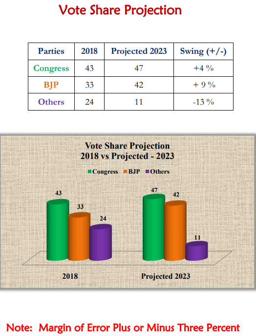 2018లో 43% ఓట్లు పొందిన కాంగ్రెస్ ఈసారి 47%, 33% ఓట్లు పొందిన బీజేపీ ఈసారి 42% పొందే అవకాశాలున్నాయని సర్వేలో తేలింది. బీజేపీ 2018 కంటే 9% ఓట్లు అధికంగా పొందనుంది. ఏ సర్వేలో అయినా మూడు శాతం మార్జిన్ వ్యత్యాసం ఉండే అవకాశాలుంటాయనేది ఇక్కడ గమనార్హం.