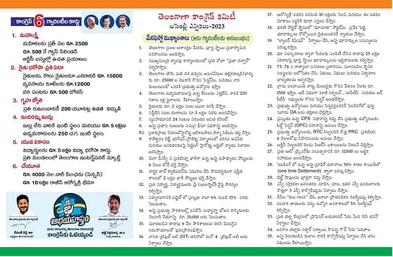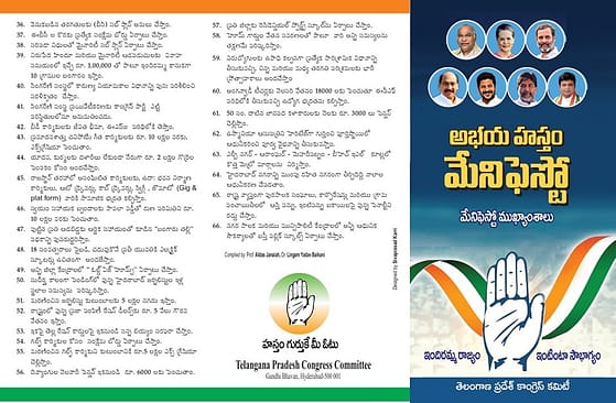 inctelangana:2023 అసెంబ్లీ ఎన్నికల్లో కాంగ్రెస్ పార్టీ తన ఎన్నికల మేనిఫెస్టో ను శుక్రవారం నాడు విడుదల చేసింది. గాంధీ భవన్ లో జరిగిన ఈ కార్యక్రమంలో ఏఐసీసీ అధ్యక్షులు మల్లికార్జున్ ఖర్గే ముఖ్యఅతిథిగా పాల్గొని మ్యానిఫెస్టో ను విడుదల చేసారు. మేనిఫెస్టో కమిటీ ఛైర్మన్ శ్రీధర్ బాబు చైర్మన్ మేనిఫెస్టో రూపొందించారు.టీపీసీసీ వర్కింగ్ ప్రసిడెంట్ మహేష్ కుమార్ గౌడ్ అధ్యక్షతన ఈ కార్యక్రమం జరిగింది.అభయహస్తం.. మేనిఫెస్టో పేరుతో ఇందిరమ్మ రాజ్యం.. ఇంటింటా సౌభాగ్యం అంటూ 37 అంశాలతో 42 పేజీలతో విడుదల చేసారు.ఈ కార్యక్రమంలో ఏఐసీసీ ఇంచార్జ్ మానిక్ రావ్ ఠాక్రే, టీపీసీసీ అధ్యక్షులు రేవంత్ రెడ్డి, సీఎల్పీ నేత భట్టి విక్రమార్క, ప్రచార కమిటీ ఛైర్మన్ మధు యాష్కీ తదితరులు పాల్గొన్నారు.