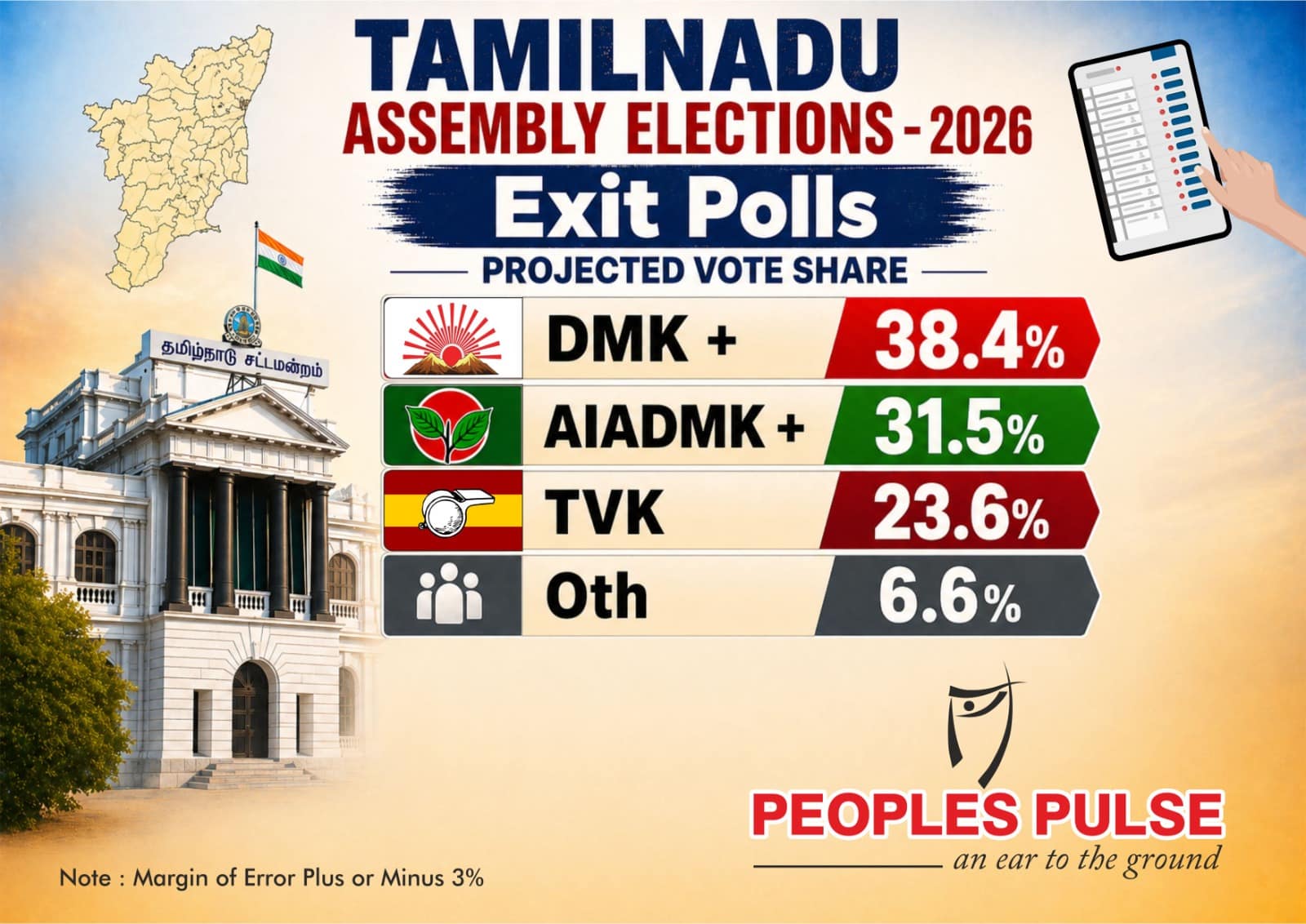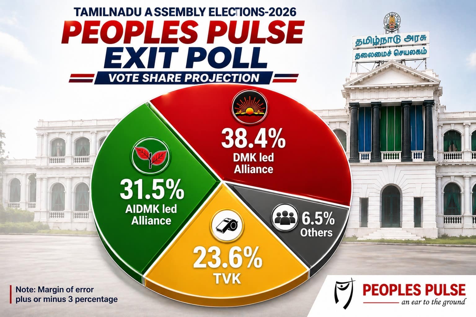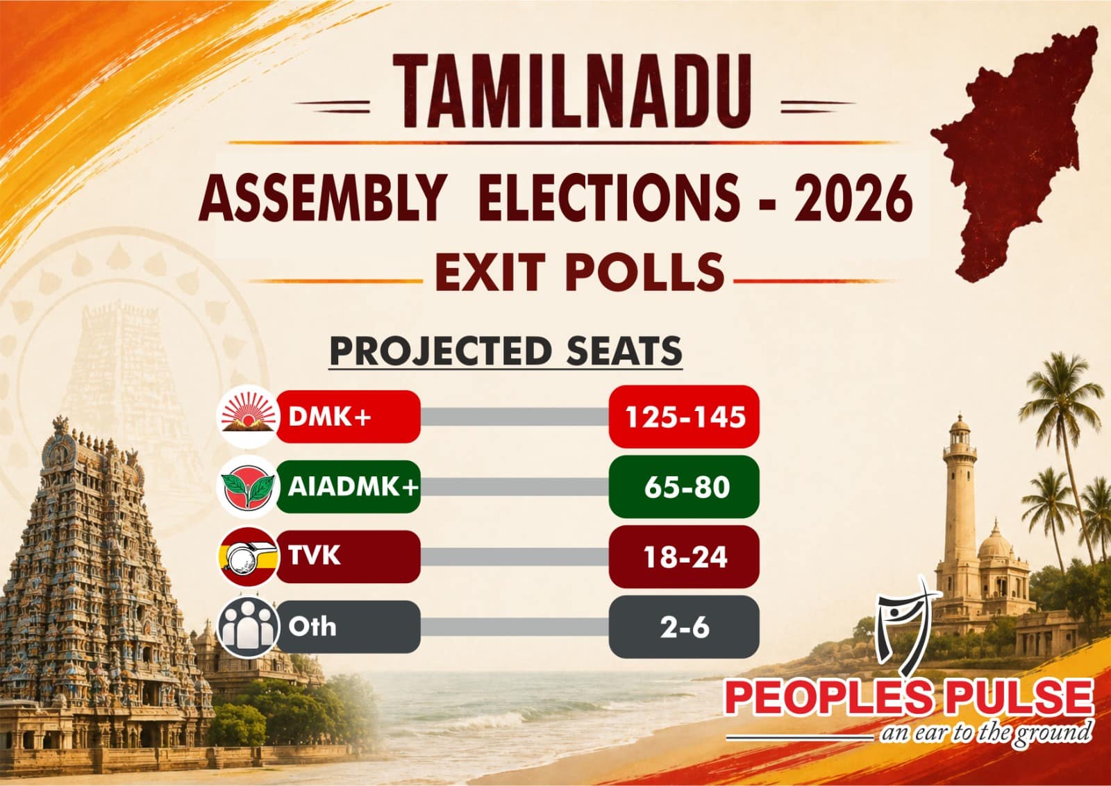 తమిళనాడు 2026 అసెంబ్లీ ఎన్నికల్లో అధికార డీఎంకే కూటమి మ‌రోసారి అధికారం చేప‌ట్ట‌నుంద‌ని పీపుల్స్ పల్స్ ఎగ్జిట్ పోల్ సర్వేలో వెల్లడైంది.