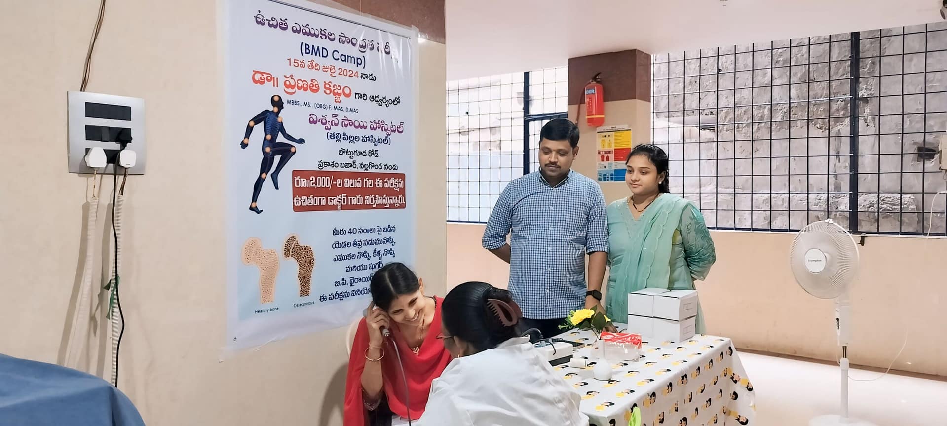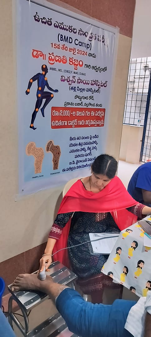 Nalgonda: పట్టణంలోని ప్రకాశంబజార్ నందు విశ్వన్ సాయి తల్లి,పిల్లల ఆసుపత్రి ఆధ్వర్యంలో ఉచిత వైద్య శిబిరం నిర్వహించడం జరిగింది . సోమవారం నిర్వహించిన ఈ శిబిరంలో.. 2వేలు విలువగల ఎముకల సాంద్రత పరీక్షలను నిర్వహించినట్లు డాక్టర్ ప్రణతి కజ్జం (MBBS., MS., (OBG) F. MAS, D. MAS ప్రసూతి మరియు స్త్రీల వైద్యనిపుణులు ఇన్ ఫర్టిలిటీ మరియు లాప్రోస్కోపిక్ సర్జన్) (Gold medalist ) తెలిపారు .
