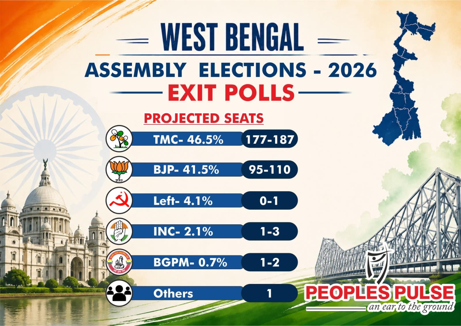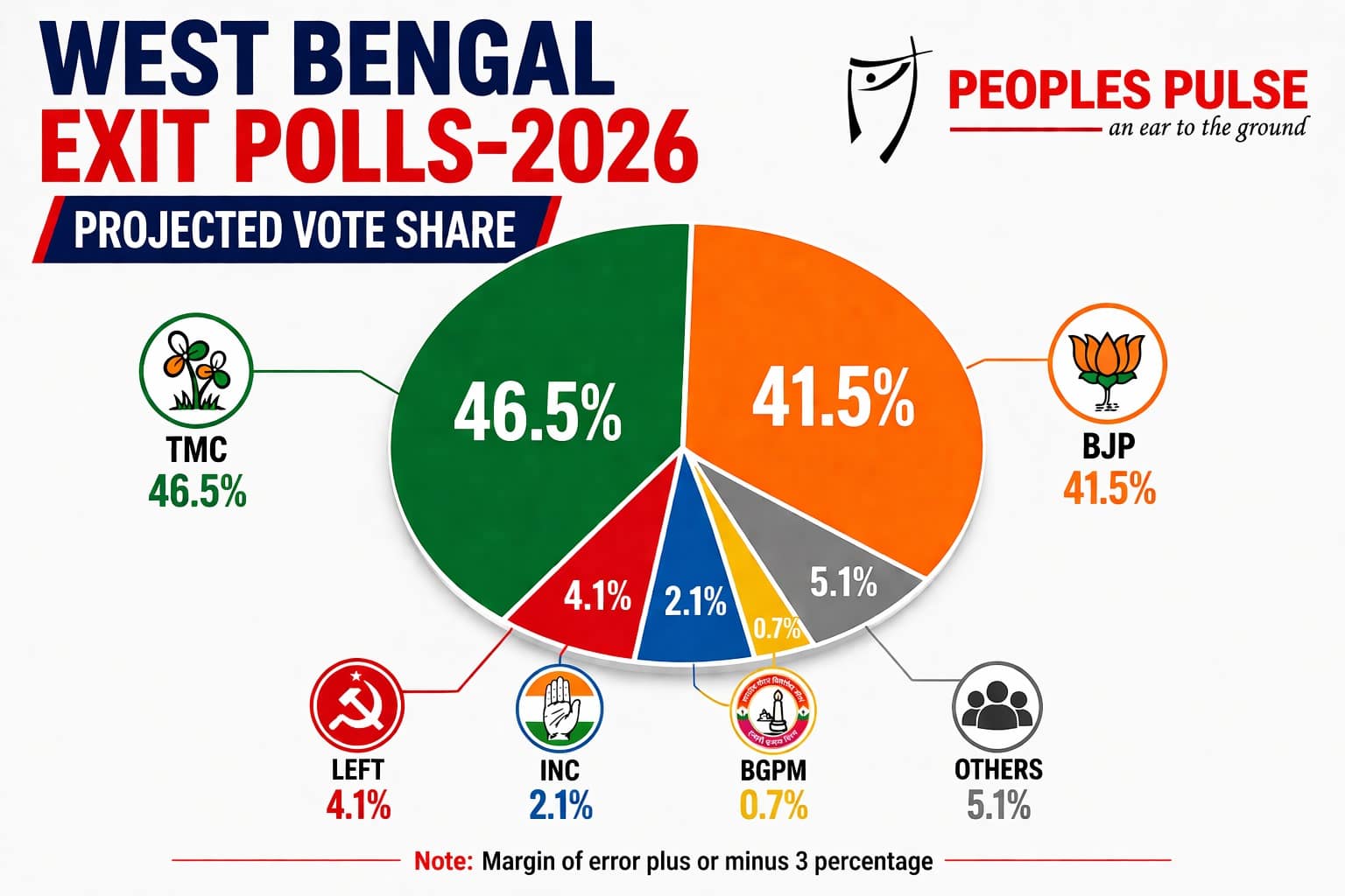 టీఎంసీ కూటమి 46.5 శాతం, బీజేపీ 41.5 శాతం, వామపక్షాలు 4.1 శాతం, కాంగ్రెస్ 2.1 శాతం, బీజీపీఎమ్ 0.7 శాతం,ఇతరులు 5.1 శాతం ఓట్లు పొందే అవకాశాలున్నాయని సర్వేలో వెల్లడైంది.