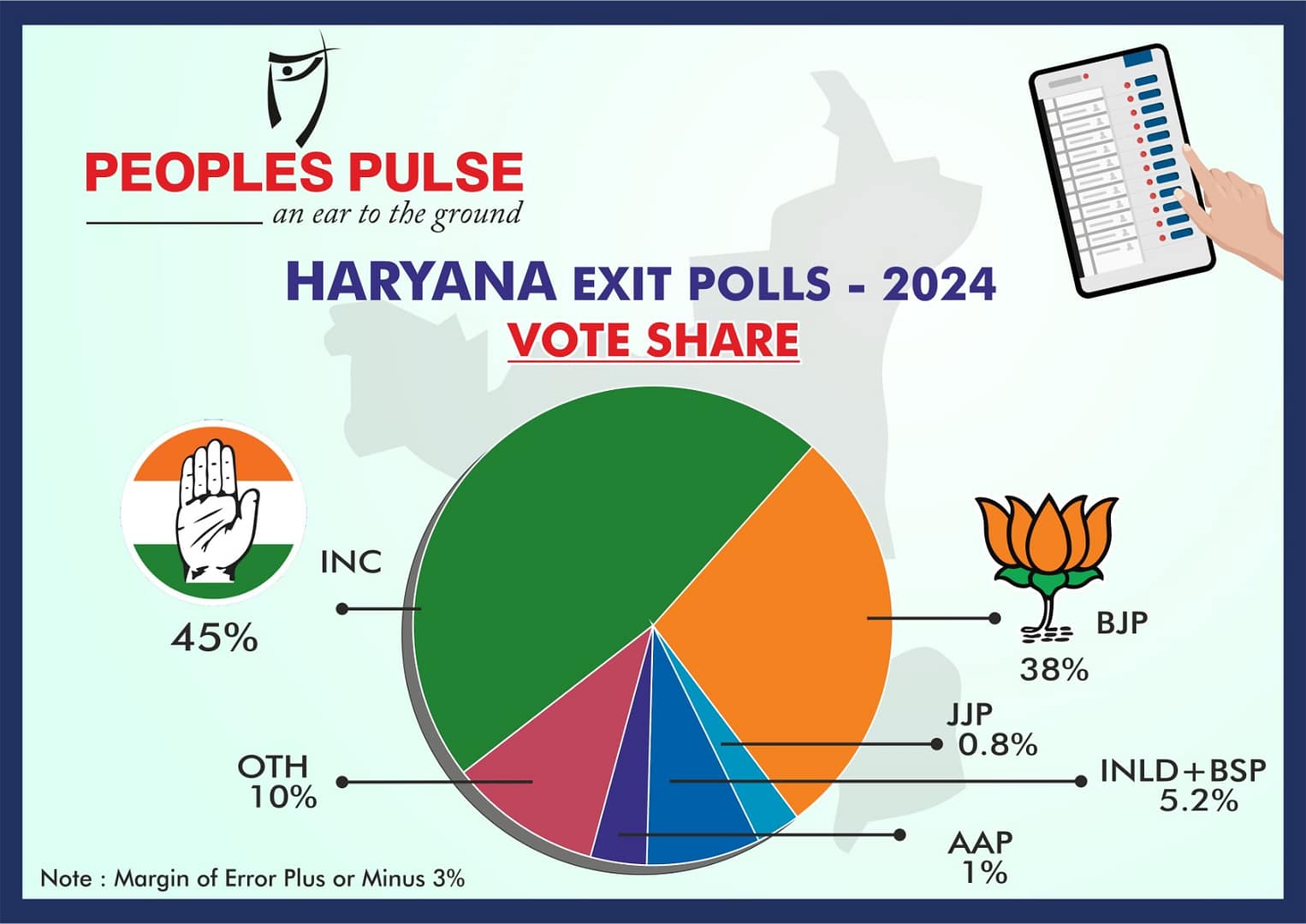 హర్యానాలో అధికారం చేపట్టాలంటే 46 సీట్లు గెలవాల్సి ఉండగా.. కాంగ్రెస్- 55 , బీజేపీ- 26 , ఐఎన్ఎల్డీ 2-3, జేజేపీ 0-1, ఇండిపెండెంట్లు 3-5 స్థానాలు గెలిచే అవకాశం ఉందని సర్వే సంస్థ ప్రకటించింది. కాంగ్రెస్ పార్టీ, తన ప్రత్యర్థి అధికార బిజెపిపై 7-8 శాతం ఓట్ల ఆధిక్యత ప్రదర్శించే అవకాశం ఉందని తెలిపింది. కాంగ్రెస్ కు 45 శాతం, బీజేపీకి 38 శాతం, ఐఎన్ఎల్డి-బీఎస్పీ కూటమి 5.2 శాతం, ఆప్ 1 శాతం, జేజేపీ ఒక్క శాతం లోపు, ఇతరులకు 10 శాతం ఓట్లు వచ్చే అవకాశం ఉందని పీపుల్స్ పల్స్ వెల్లడించింది.