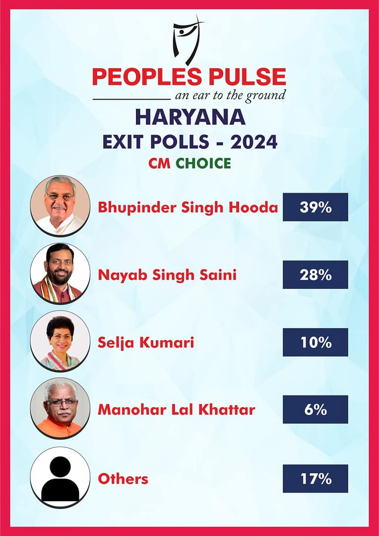 ఇక హర్యానాకి కాబోయే సిఎం ఎవరు అన్న ప్రశ్నకు? సీఎల్పీ లీడర్ భూపీందర్ సింగ్ హూడాకు 39 శాతం, సిట్టింగ్ సీఎం నయాబ్ సింగ్ సైనీకి 28 శాతం, కాంగ్రెస్ ఎంపీ కుమారీ సెల్జాకు 10 శాతం, కేంద్ర మంత్రి మనోహర్ లాల్ ఖట్టర్ కు 6 శాతం మంది ఈ ఎన్నికల తర్వాత ముఖ్యమంత్రి కావాలని మద్దతిస్తున్నట్లు పీపుల్స్పల్స్ పేర్కొంది. ప్రధాన పోటీ జాతీయ పార్టీలు బీజేపీ, కాంగ్రెస్ మధ్యే ఉందని ప్రాంతీయ పార్టీలు ఇండియన్ నేషనల్ లోక్ దళ్, జననాయక్ జనతా పార్టీల ప్రభావం అంతంత మాత్రమేనని పీపుల్స్ పల్స్ స్పష్టం చేసింది.