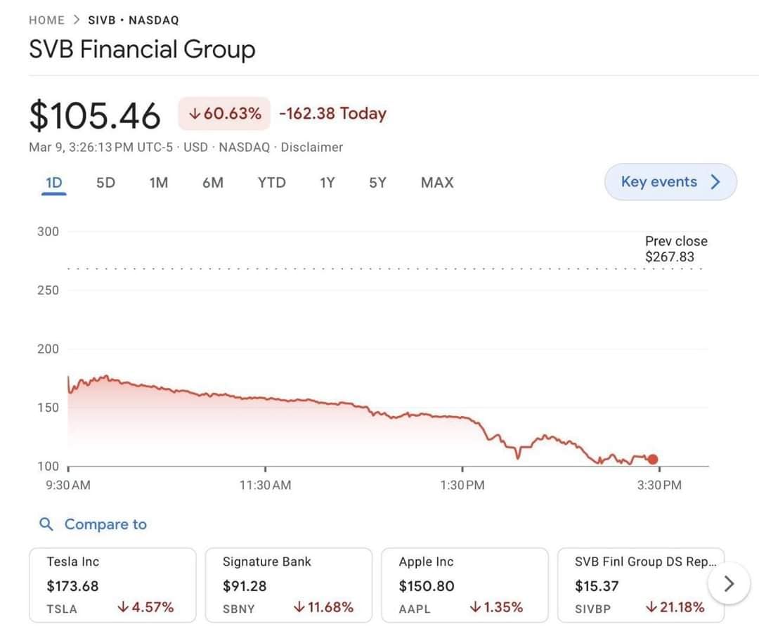 గురువారం మార్చి 9, 2023 న సిలికాన్ వాలీ బాంక్ షేర్లు ఉన్నట్లుండి 60% పడిపోయాయి ! ఇది జరిగింది కేవలం SVB మూతపడబోతున్నది అంటూ పుకార్లు రావడమే కారణం ! స్టాక్ మార్కెట్ లో ఎప్పుడయితే షేర్ వాల్యూ పడిపోయిందో వెంటనే డిపాజిటర్లు తమ డిపాజిట్ల ని కాన్సిల్ చేసుకోవడానికి ఒక్క సారిగా అందరూ పోటీ పడడం తో వాళ్ళకి ఇవ్వాల్సిన డబ్బు అంటే లిక్విడ్ కాష్ బాంక్ దగ్గర లేకపోవడంతో సమస్య మరింత తీవ్ర రూపం దాల్చింది! మరుసటి రోజున మరో 9% షేర్ల ధరలు పడిపోవడం జరిగింది.