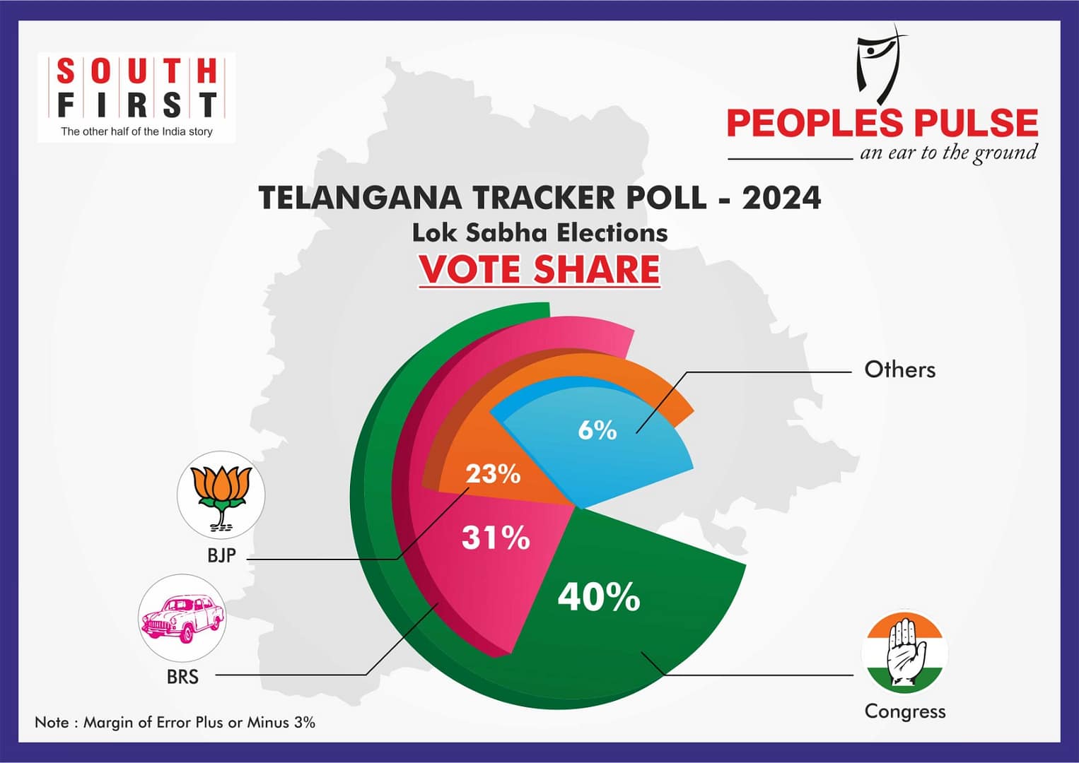 ఇక ఓట్ల శాతం పరంగా చూసుకుంటే..కాంగ్రెస్పార్టీకు 40 శాతం, బీఆర్ఎస్కు 31 శాతం, బిజెపి 23 శాతం, ఇతరులకు 6 శాతం ఓట్లు వచ్చే అవకాశం ఉన్నట్లు పీపుల్స్పల్స్ – సౌత్ఫస్ట్ సర్వే రిపోర్టు చెబుతోంది.