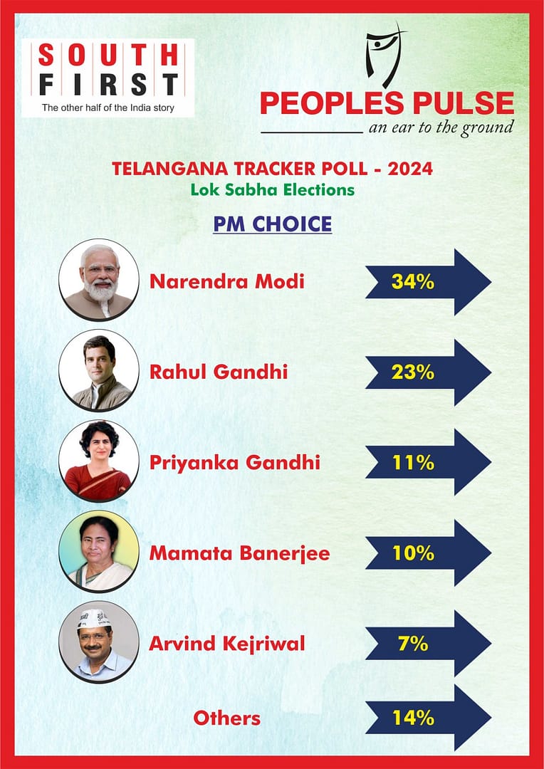 పీపుల్స్పల్స్- సౌత్ఫస్ట్ సంస్థలు తెలంగాణలో లోక్సభ ఎన్నికలపై 11 ఫిబ్రవరి నుండి 17 ఫిబ్రవరి వరకు ట్రాకర్ పోల్ సర్వేను నిర్వహించింది. తెలంగాణలో లోక్సభ ఎన్నికల ట్రాకర్ పోల్ సర్వే కోసం ప్రతీ పార్లమెంట్ నియోజకవర్గంలో 3 అసెంబ్లీ సెగ్మెంట్లల్లో, 4600 శాంపిల్స్తో ఈ సర్వే నిర్వహించినట్లు ప్రకటించింది.