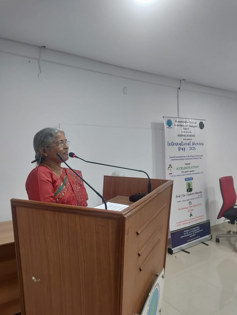 ‘ఆది ధ్వని ఫౌండేషన్’ తో అనుబంధం కలిగి ఉన్న పాలమూరు యూనివర్సిటీ ఆంగ్ల విభాగాధిపతి మాజీ ప్రొఫెసర్ డా.గూడూరు మనోజ ముఖ్య అతిథిగా విచ్చేశారు.వారు మాట్లాడుతూ ఆది ధ్వని ఆధ్వర్యంలో ఆదివాసీ ప్రాంతాలలో మా బృందం పర్యటించినప్పడు ఆదివాసీ ప్రజలకు అనారోగ్య సమస్యలు రాకుండా ఇంగ్లిష్ మందులు వాడమని వారికి అందించమన్నారు.కానీ వారు ఇంగ్లిష్ మందులకు దూరంగా ఉన్నారు అని తెలిపారు . హోమియోపతి, ఆయుర్వేదంకీ దగ్గర పోలికలు కొంతమేరకు ఉంటాయి అని చెప్పారు. ఆదివాసీ ప్రజలు ఆ హోమియోపతిలో వనమూలికలు గ్రహించే అవకాశం ఉందని చెప్పారు.ఆదివాసీ ప్రాంతాలకు హోమియో బృందం విచ్చేసి గిరిజన ప్రాంత ప్రజలకు అవగాహతో హోమియో మందులతో పాటు మెరుగైన వైద్యం అందిస్తే మంచి ఫలితాలు ఉంటాయి అని అన్నారు.మహిళా హోమియో వైద్యులకు జ్ఞాపికలను అందజేశారు.దాదాపు 40 మందికి పైగా మహిళలను సత్కరించారు.