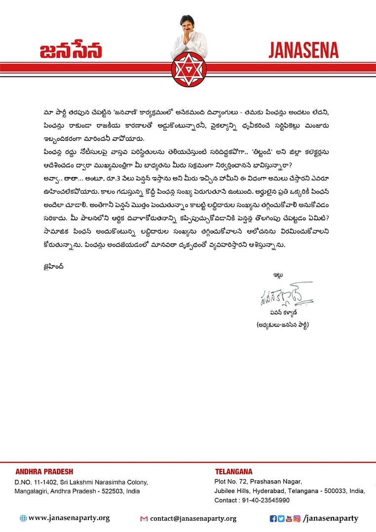 ఆంధ్రప్రదేశ్లో సామజిక పింఛన్ల తొలగింపు ప్రక్రియపై జనసేన అధినేత పవన్ కళ్యాణ్ ..ముఖ్యమంత్రి జగన్ కు లేఖాస్త్రం సంధించారు. పింఛన్ల తొలగింపు కసరత్తు ఆమోదయోగ్యం కాదన్నారు. ఈ చర్య పేదలను ఇబ్బందుల పాలుజేసే విధంగా ఉందన్నారు. పింఛన్లు ఎందుకు తొలగించకూడదో చెప్పాలంటూ సుమారుగా 4 లక్షల మంది లబ్ధిదారులకి నోటీసులు జారీ చేయడం హేయమైన చర్యగా అభివర్ణించారు. లబ్ది దారులను తొలగించేందుకు అధికారులు చూపించిన కారణాలు సహేతుకంగా లేవని ఆగ్రహం వ్యక్తం చేశారు. ఈ నేపథ్యంలోనే పింఛన్ల రద్దుపై తన దృష్టికి వచ్చిన నోటీసు కారణాలను పవన్ లేవనెత్తారు. శ్రీకాకుళం జిల్లా మెళియాపుట్టి మండలంలో కొందరు వృద్ధులకు.. ఒక్కొక్కరి పేరునా వేల ఎకరాల భూములు ఉన్నాయని సాకుగా చూపి నోటీసులిచ్చారని మండి పడ్డారు. అదే నిజమైతే వృద్ధులకు భూములకు సంబంధించిన పట్టాదారు పాస్ పుస్తకాలు ఇప్పించవలసిందిగా విజ్ఞప్తి చేస్తున్నట్లు జనసేనాని పేర్కొన్నారు.