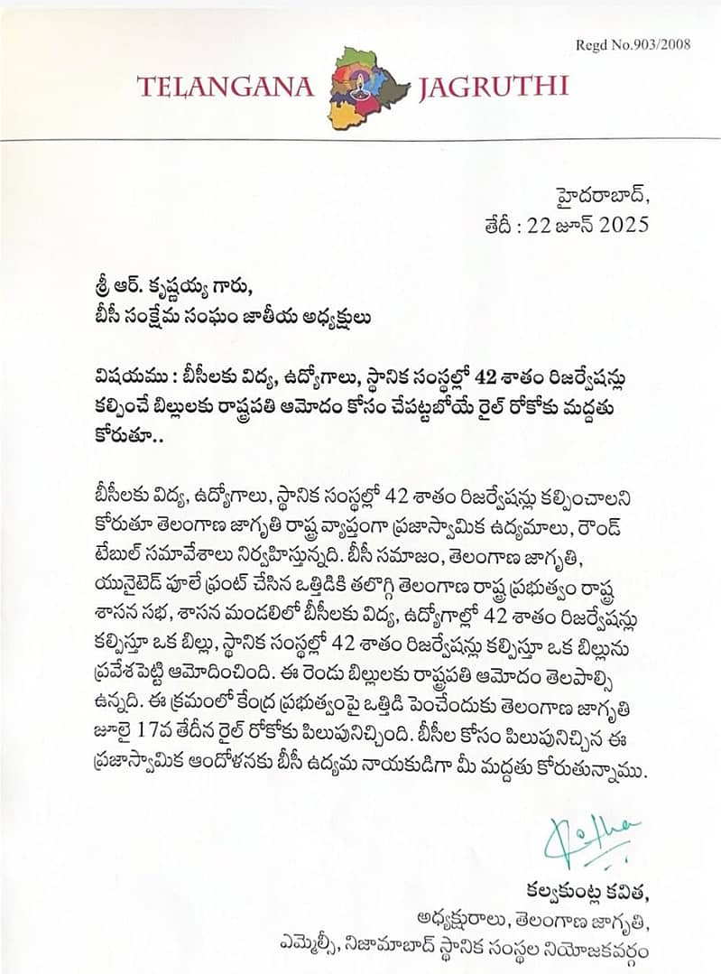 బీసీలకు 42 శాతం రిజర్వేషన్ల సాధనే ఏకైక లక్ష్యంగా పెట్టుకుని కవిత రాజకీయాలకు అతీతంగా వివిధ రాజకీయ పార్టీల నేతలను, బీసీ సంఘాలను, పౌర సమాజ నేతలను కలుపుకుంటూ మద్దతు కూడగట్టే పనిలో నిమగ్నమయ్యారు. ఇందులో భాగంగా ఆదివారం( ఈ రోజు)బీజేపీకి చెందిన రాజ్యసభ సభ్యుడు, బీసీ నాయకుడు ఆర్.కృష్ణయ్యతో ఆమె ప్రత్యేకంగా భేటీ అయ్యారు. పలు విషయాలపై సుధీర్ఘంగా చర్చించిన అనంతరం మద్దతు కోసం కృష్ణయ్యకు లేఖ రాయడం ప్రాధాన్యత సంతరించుకుంది.