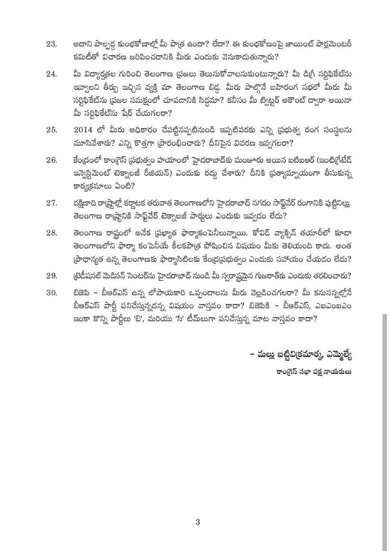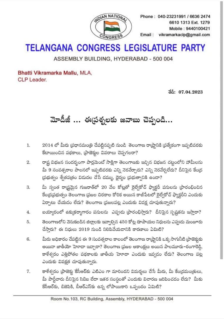 ప్రధాన మంత్రి నరేంద్ర మోడీ తెలంగాణా పర్యటన నేపథ్యంలో సీఎల్పీ నేత భట్టి విక్రమార్క 30 ప్రశ్నలతో కూడిన లేఖను మీడియాకు విడుదల చేశారు. లేఖలో పేర్కొన్న ప్రశ్నలకు ప్రధాని సమాధానం చెప్పాలని భట్టి డిమాండ్ చేశారు.