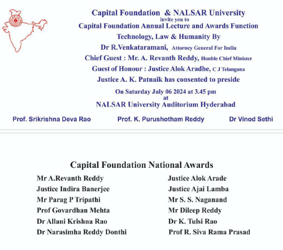 ఇక అవార్డుల ప్రధానోత్సవ కార్యక్రమం ఈనెల 6 న నల్సార్ యూనివర్శిటీలో నిర్వహించబోతున్నట్లు క్యాపిటల్ ఫౌండేషన్ సభ్యులు పురుషోత్తం రెడ్డి, శివప్రసాదరావు, లీలాలక్ష్మారెడ్డి ఓ ప్రకటనలో తెలిపారు. ఈకార్యక్రమానికి తెలంగాణ ముఖ్యమంత్రి రేవంత్ రెడ్డి,హైకోర్టు ప్రధాన న్యాయమూర్తి జస్టిస్ ఆలోక్ ఆరాధే, సుప్రీంకోర్టు మాజీ న్యాయమూర్తి జస్టిస్ ఏకే పట్నాయక్ హాజరవుతున్నట్లు ప్రకటనలో పేర్కొన్నారు.