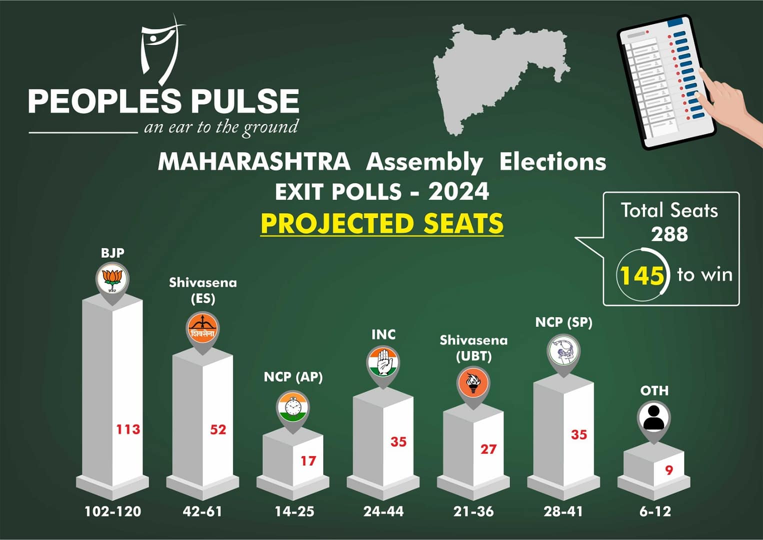 మహారాష్ట్రలో బీజేపీ అతిపెద్దగా అవతరించే అవకాశాలున్నాట్టు పీపుల్పల్స్ ఎగ్జిట్ పోల్లో వెల్లడైంది. బీజేపీ 113(102 నుండి 120) స్థానాలు, శివసేన (ఏక్నాథ్ షిండే) పార్టీ 52 (42 నుండి 61) స్థానాలు, ఎన్సీపీ (అజిత్ పవార్) పార్టీ 17(14 నుండి 25) స్థానాలు, కాంగ్రెస్ 35(24 నుండి 44) స్థానాలు, శివసేన (యూబీటీ) 27(21 నుండి 36) స్థానాలు, ఎన్సీపీ (ఎస్పీ) 35 (28 నుండి 41) స్థానాలు, ఇతరులు 9 (6 నుండి 12) స్థానాలు గెలిచే అవకాశాలున్నాయి.
