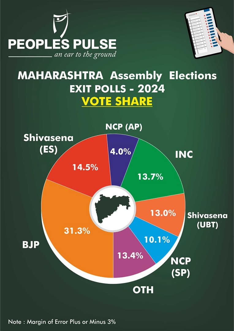 మహాయుతికి 49.8 శాతం, ఎమ్వీఏ 40.1 శాతం, ఇతరులకు 10.1 శాతం ఓట్లు వచ్చే అవకాశాలున్నాయి. బీజేపీ 31.3 శాతం, శివసేన (షిండే) 14.5 శాతం, ఎన్సీపీ (ఏపీ) 4 శాతం, కాంగ్రెస్ 13.7 శాతం, శివసేన (యూబీటీ) 13 శాతం, ఎన్సీపీ (ఎస్పీ) 10.1 శాతం, ఇతరులు 13.4 శాతం ఓట్లు పొందే అవకాశాలున్నాయిని ఎగ్జిట్ పోల్లో తేలింది.