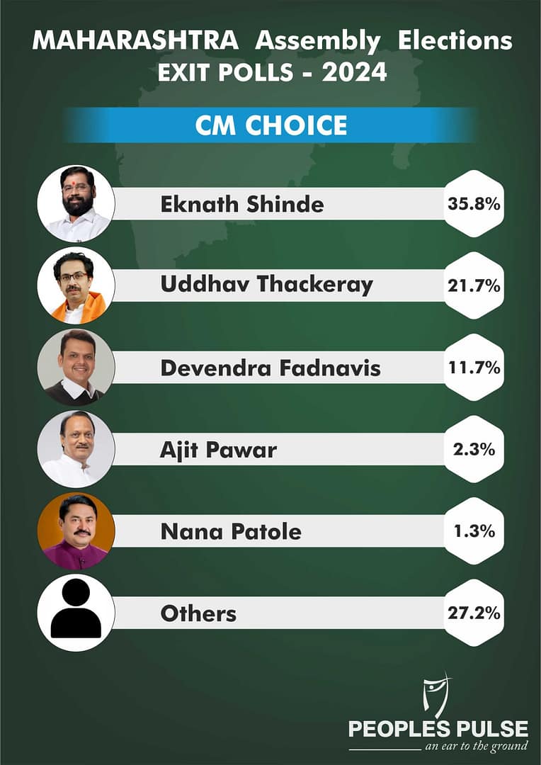 ముఖ్యమంత్రిగా ఎవరికి ప్రాధాన్యతిస్తారని ఓటర్లను ప్రశ్నించగా ఏక్నాథ్ శిండేకు 35.8 శాతం, ఉద్దవ్ ఠాక్రేకు 21.7 శాతం, దేవంద్ర ఫడ్నవీస్కు 11.7 శాతం, రాజ్థాక్రేకు 2.9 శాతం, అజిత్ పవార్కు 2.3 శాతం, జయంత్ పాటిల్కు 2.1 శాతం, నానా పాటోల్కు 1.3 శాతం, ప్రకాశ్ అంబేద్కర్కు 1.3 శాతం ఓటర్లు మద్దతిచ్చారు.
