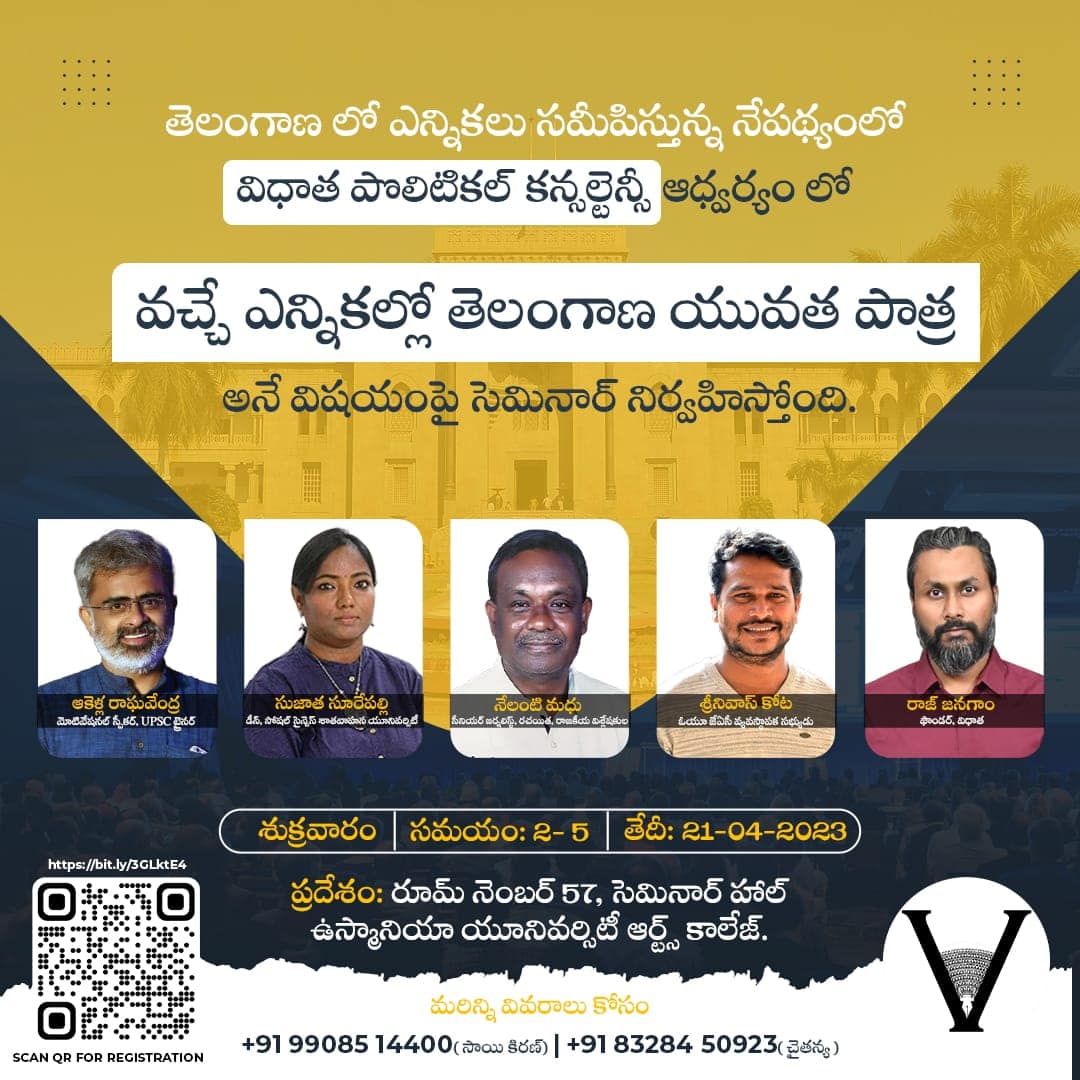 Telangana: తెలంగాణలో ఎన్నికల గడువు ముంచుకొస్తుంది. రానున్న ఎన్నికల్లో యువత కీలకపాత్ర పోషించే అవకాశం స్పష్టంగా కనిపిస్తోంది. ఈనేపథ్యంలో విధాత పోలిటికల్ కన్సల్టెన్సీ.. రానున్న ఎన్నికల్లో యువత పాత్ర అనే అంశంపై సెమినార్ నిర్వహిస్తోంది. ఈకార్యక్రమానికి మేధావులు , పోలిటికల్ ఎనలిస్టులు, విద్యార్థి సంఘం నేతలు హాజరుకానున్నారు. కావున యువత పెద్ద ఎత్తున తరలివచ్చి ఈకార్యక్రమాన్ని విజయవంతం చేయాలని పోలిటికల్ సంస్థ డైరెక్టర్ పిలుపునిచ్చారు. ఇంట్రెస్ట్ ఉన్న క్యాండెట్స్ క్రింద ఇచ్చిన లింక్ లో మీ వివరాలను నమోదు చేసుకోండి.