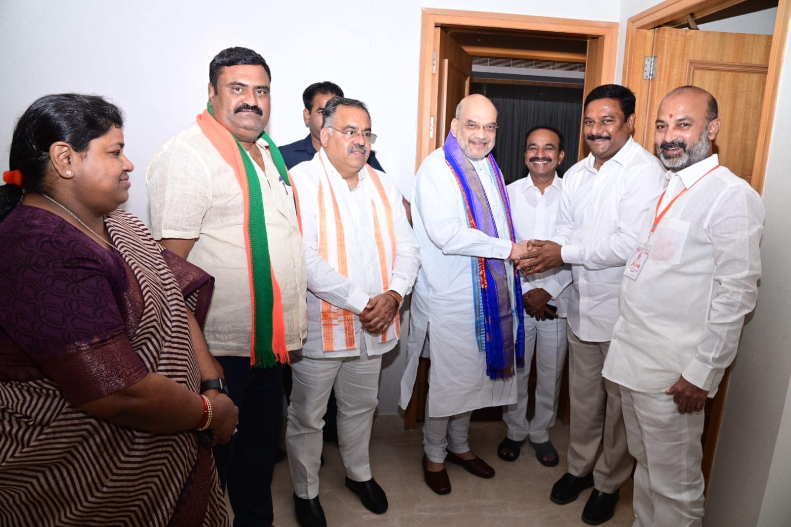 (ఇటీవల బీజేపీలో చేరిన నిర్మల్ మాజీ ఎమ్మెల్యే మహేశ్వర్ రెడ్డిని శంషాబాద్ నోవాటెల్ హోటల్ లో కేంద్ర హోంశాఖ మంత్రి అమిత్ షా కు పరిచయం చేస్తున్న బీజేపీ రాష్ట్ర అధ్యక్షులు, ఎంపీ బండి సంజయ్ కుమార్. చిత్రంలో పార్టీ రాష్ట్ర వ్యవహారాల ఇంఛార్జ్ తరుణ్ చుగ్, జాతీయ కార్యవర్గ సభ్యులు ఈటల రాజేందర్, రాష్ట్ర ప్రధాన కార్యదర్శులు దుగ్యాల ప్రదీప్ కుమార్, బంగారు శ్రుతి)