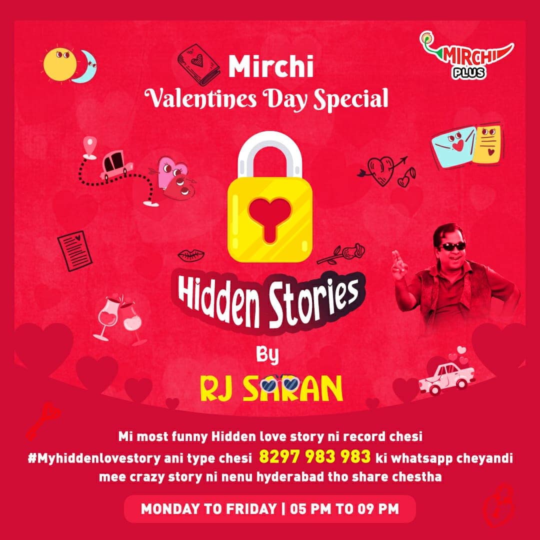 సాయంత్రం 5 నుంచి 9 గంటల వరకు ఆర్జే సరన్ మిర్చి ‘హిడెన్ ల’వ్ స్టోరీస్ షో నిర్వహించారు. చిన్నప్పటి నుంచి దాచుకున్న లవ్ స్టోరీస్, వన్ సైడ్ లవ్ స్టోరీస్, ఇప్పటికి చెప్పలేకపోయిన హిడెన్ లవ్ స్టోరీస్ ని శ్రోతలు సరన్ తో పంచుకున్నారు. ముఖ్యంగా ఇతరులకు ఇబ్బంది కలిగించకుండా పేరు మార్చి చెప్పమని కోరిన సరన్ కి, శ్రోతలు సహకరించి సహృదయంతో తమ హృదయంలో దాచుకున్న ప్రేమను పంచుకున్నారు. వీరితో పాటు చాలామంది బావ మరదళ్లు కూడా ఫోన్ చేసి మాట్లాడటం ఈ షోలో హైలెట్ గా నిలిచింది. వీటితో పాటు మిర్చి వాట్సాప్ కి పంపిన రికార్డెడ్ లవ్ స్టోరీస్ ని రేడియోలో చదివి వినిపించారు. రాత్రి వచ్చే డార్లింగ్ స్వేత షోలో… స్వీట్ లవ్ స్టోరీస్ వినిపించారు. ఈ షోలో ఆమె శ్రోతలను తమ ప్రేమ కథల్ని వీడియో రూపంలో పంపమని అడిగారు. దీనికి మంచి స్పందన వచ్చింది. ఎంతోమంది కపుల్స్ తమ లవ్ స్టోరీస్ ని వీడియో రూపంలో షేర్ చేశారు. వారిలో లక్కీ కపుల్స్ గా ఎంపికైన వారికి వాలంటైన్స్ డే రోజు మిర్చి టీం, ప్రత్యేకమైన డిన్నర్ ఏర్పాటు చేసింది.